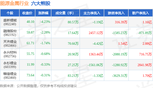 个股表现方面,能源金属行业当日领跌股为盛新锂能(002240),该股当日报收40.1,下跌4.23%,成交量80.57万,主力资金净流出1.19亿元。融捷股份(002192)以下跌2.28%紧随其后,该股当日成交量17.64万,主力资金净流入2457.12万元。除此之外,天齐锂业(002466)、永兴材料(002756)、永杉锂业(603399)均进入当日熊股之列。具体个股列表见下表: