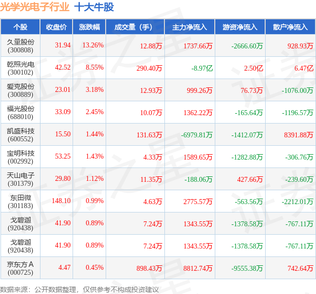 个股表现方面,光学光电子行业当日领涨股为久量股份(300808),该股当日报收31.94,上涨13.26%,成交量12.88万,主力资金净流入1737.66万元。乾照光电(300102)以上涨8.55%紧随其后,该股当日成交量290.4万,主力资金净流出8.97亿元。除此之外,爱克股份(300889)、福光股份(688010)、凯盛科技(600552)均进入当日牛股之列。具体个股列表见下表: