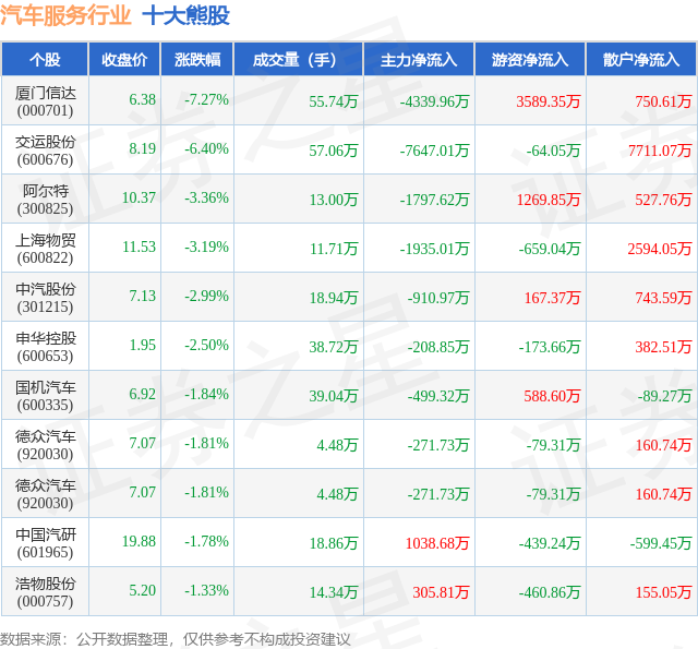 个股表现方面,汽车服务行业当日领跌股为厦门信达(000701),该股当日报收6.38,下跌7.27%,成交量55.74万,主力资金净流出4339.96万元。交运股份(600676)以下跌6.4%紧随其后,该股当日成交量57.06万,主力资金净流出7647.01万元。除此之外,阿尔特(300825)、上海物贸(600822)、中汽股份(301215)均进入当日熊股之列。具体个股列表见下表: