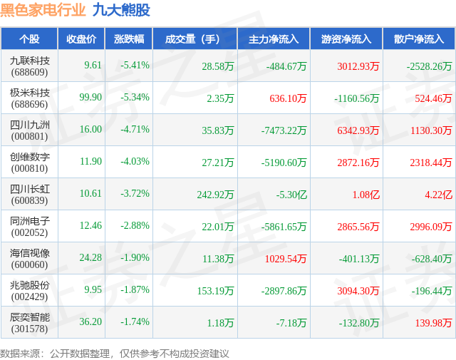 个股表现方面,黑色家电行业当日领跌股为九联科技(688609),该股当日报收9.61,下跌5.41%,成交量28.58万,主力资金净流出484.67万元。极米科技(688696)以下跌5.34%紧随其后,该股当日成交量2.35万,主力资金净流入636.1万元。除此之外,四川九洲(000801)、创维数字(000810)、四川长虹(600839)均进入当日熊股之列。具体个股列表见下表: