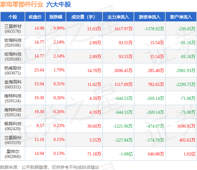 个股表现方面,家电零部件行业当日领涨股为三星新材(603578),该股当日报收14.98,上涨9.99%,成交量21.03万,主力资金净流入1617.97万元。宏海科技(920108)以上涨2.14%紧随其后,该股当日成交量2.89万,主力资金净流入93.55万元。除此之外,宏海科技(920108)、热威股份(603075)、金海高科(603311)均进入当日牛股之列。具体个股列表见下表: