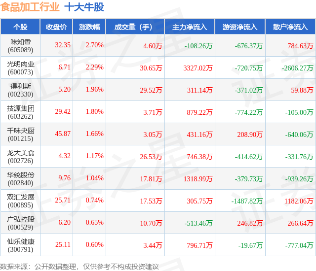 个股表现方面,食品加工行业当日领涨股为味知香(605089),该股当日报收32.35,上涨2.7%,成交量4.6万,主力资金净流出108.26万元。光明肉业(600073)以上涨2.29%紧随其后,该股当日成交量30.65万,主力资金净流入3327.02万元。除此之外,得利斯(002330)、技源集团(603262)、千味央厨(001215)均进入当日牛股之列。具体个股列表见下表:
