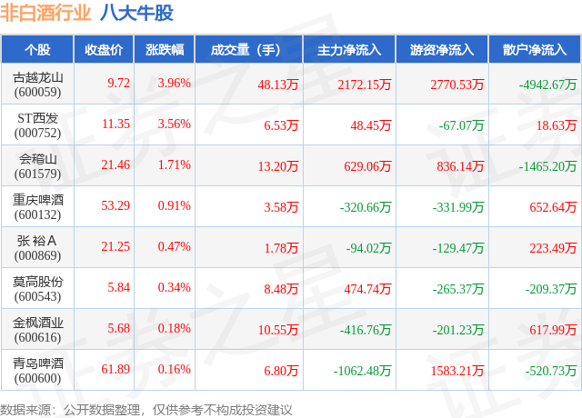 个股表现方面,非白酒行业当日领涨股为古越龙山(600059),该股当日报收9.72,上涨3.96%,成交量48.13万,主力资金净流入2172.15万元。ST西发(000752)以上涨3.56%紧随其后,该股当日成交量6.53万,主力资金净流入48.45万元。除此之外,会稽山(601579)、重庆啤酒(600132)、张 裕A(000869)均进入当日牛股之列。具体个股列表见下表: