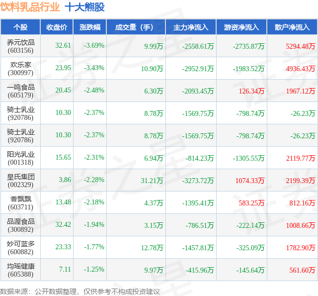 个股表现方面,饮料乳品行业当日领跌股为养元饮品(603156),该股当日报收32.61,下跌3.69%,成交量9.99万,主力资金净流出2558.61万元。欢乐家(300997)以下跌3.43%紧随其后,该股当日成交量10.9万,主力资金净流出2952.91万元。除此之外,一鸣食品(605179)、骑士乳业(920786)、骑士乳业(920786)均进入当日熊股之列。具体个股列表见下表: