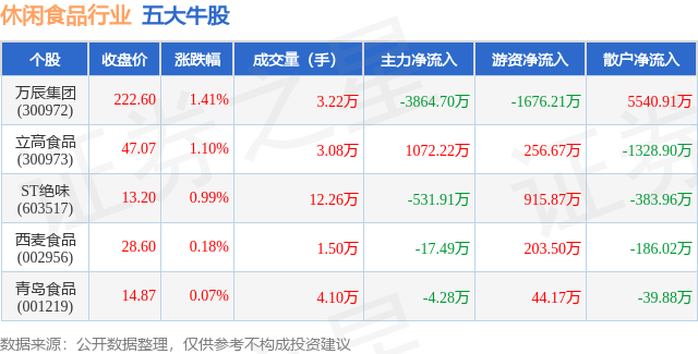 个股表现方面,休闲食品行业当日领涨股为万辰集团(300972),该股当日报收222.6,上涨1.41%,成交量3.22万,主力资金净流出3864.7万元。立高食品(300973)以上涨1.1%紧随其后,该股当日成交量3.08万,主力资金净流入1072.22万元。除此之外,ST绝味(603517)、西麦食品(002956)、青岛食品(001219)均进入当日牛股之列。具体个股列表见下表: