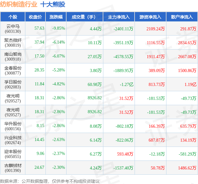 个股表现方面,纺织制造行业当日领跌股为云中马(603130),该股当日报收57.63,下跌9.85%,成交量4.44万,主力资金净流出2401.11万元。聚杰微纤(300819)以下跌6.14%紧随其后,该股当日成交量10.11万,主力资金净流出3951.19万元。除此之外,南山智尚(300918)、金春股份(300877)、孚日股份(002083)均进入当日熊股之列。具体个股列表见下表: