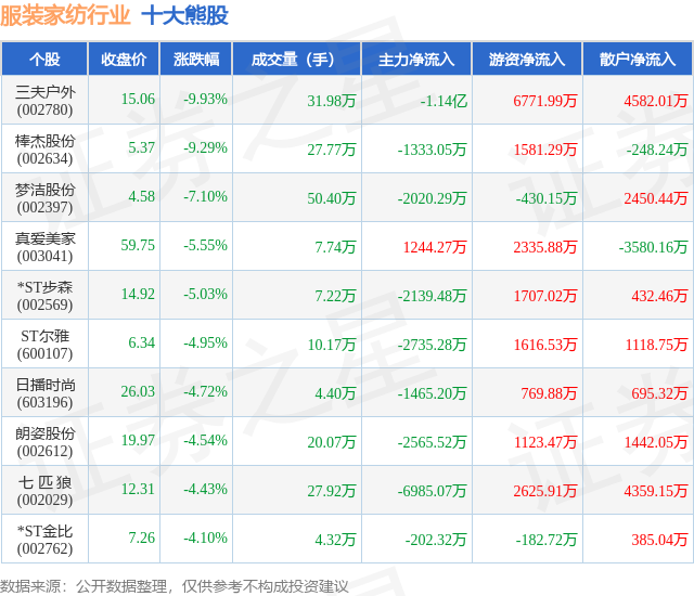个股表现方面,服装家纺行业当日领跌股为三夫户外(002780),该股当日报收15.06,下跌9.93%,成交量31.98万,主力资金净流出1.14亿元。棒杰股份(002634)以下跌9.29%紧随其后,该股当日成交量27.77万,主力资金净流出1333.05万元。除此之外,梦洁股份(002397)、真爱美家(003041)、*ST步森(002569)均进入当日熊股之列。具体个股列表见下表: