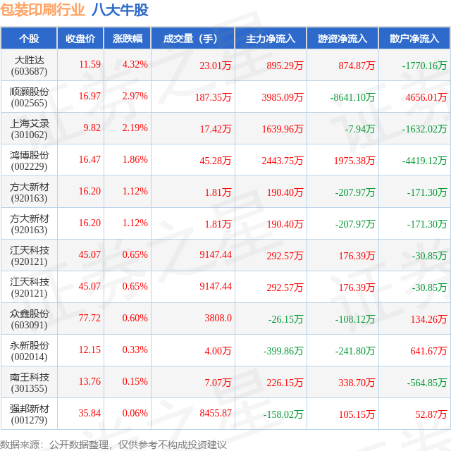 个股表现方面,包装印刷行业当日领涨股为大胜达(603687),该股当日报收11.59,上涨4.32%,成交量23.01万,主力资金净流入895.29万元。顺灏股份(002565)以上涨2.97%紧随其后,该股当日成交量187.35万,主力资金净流入3985.09万元。除此之外,上海艾录(301062)、鸿博股份(002229)、方大新材(920163)均进入当日牛股之列。具体个股列表见下表: