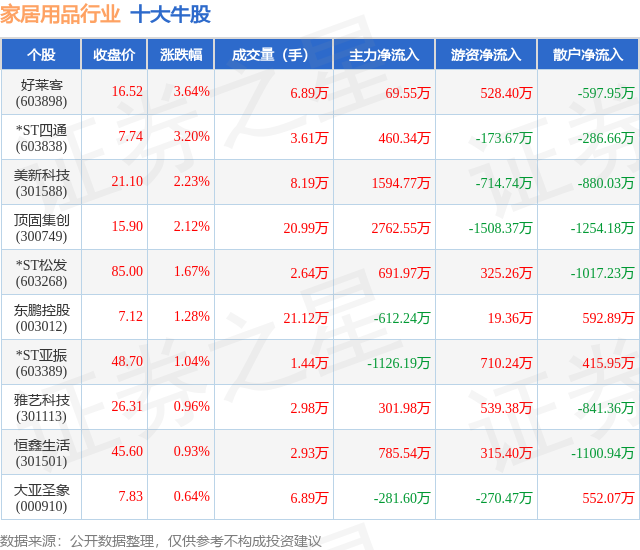 个股表现方面,家居用品行业当日领涨股为好莱客(603898),该股当日报收16.52,上涨3.64%,成交量6.89万,主力资金净流入69.55万元。*ST四通(603838)以上涨3.2%紧随其后,该股当日成交量3.61万,主力资金净流入460.34万元。除此之外,美新科技(301588)、顶固集创(300749)、*ST松发(603268)均进入当日牛股之列。具体个股列表见下表: