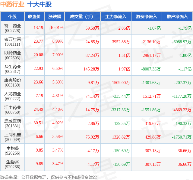 个股表现方面,中药行业当日领涨股为特一药业(002728),该股当日报收13.19,上涨10.01%,成交量59.59万,主力资金净流入2.86亿元。粤万年青(301111)以上涨8.99%紧随其后,该股当日成交量24.85万,主力资金净流入3952.88万元。除此之外,以岭药业(002603)、众生药业(002317)、康惠股份(603139)均进入当日牛股之列。具体个股列表见下表: