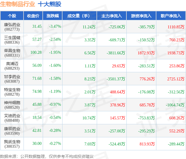 个股表现方面,生物制品行业当日领跌股为康弘药业(002773),该股当日报收31.45,下跌3.47%,成交量11.24万,主力资金净流出725.06万元。三生国健(688336)以下跌2.54%紧随其后,该股当日成交量3.35万,主力资金净流出609.71万元。除此之外,荣昌生物(688331)、奥浦迈(688293)、甘李药业(603087)均进入当日熊股之列。具体个股列表见下表: