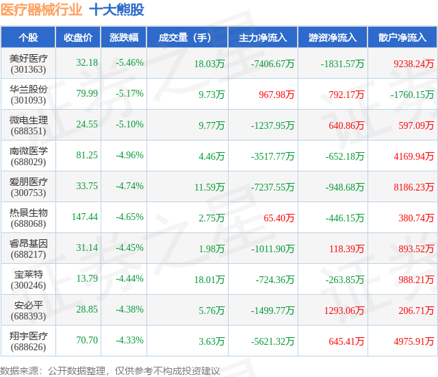 个股表现方面,医疗器械行业当日领跌股为美好医疗(301363),该股当日报收32.18,下跌5.46%,成交量18.03万,主力资金净流出7406.67万元。华兰股份(301093)以下跌5.17%紧随其后,该股当日成交量9.73万,主力资金净流入967.98万元。除此之外,微电生理(688351)、南微医学(688029)、爱朋医疗(300753)均进入当日熊股之列。具体个股列表见下表: