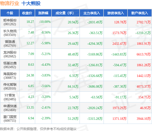 个股表现方面,物流行业当日领跌股为炬申股份(001202),该股当日报收18.27,下跌10.0%,成交量20.94万,主力资金净流出2831.49万元。长久物流(603569)以下跌8.56%紧随其后,该股当日成交量26.36万,主力资金净流出363.51万元。除此之外,普路通(002769)、龙洲股份(002682)、恒基达鑫(002492)均进入当日熊股之列。具体个股列表见下表: