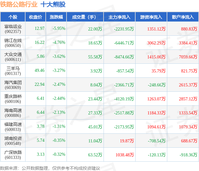 个股表现方面,铁路公路行业当日领跌股为富临运业(002357),该股当日报收12.97,下跌5.95%,成交量22.0万,主力资金净流出2231.95万元。锦江在线(600650)以下跌4.76%紧随其后,该股当日成交量18.65万,主力资金净流出6446.71万元。除此之外,大众交通(600611)、三羊马(001317)、海汽集团(603069)均进入当日熊股之列。具体个股列表见下表: