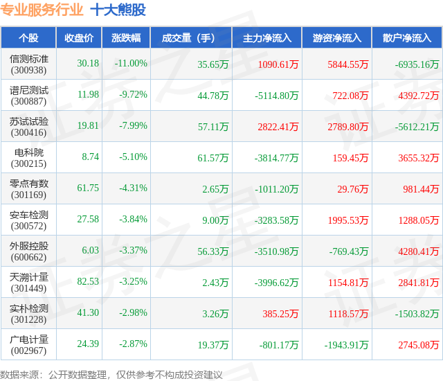 个股表现方面,专业服务行业当日领跌股为信测标准(300938),该股当日报收30.18,下跌11.0%,成交量35.65万,主力资金净流入1090.61万元。谱尼测试(300887)以下跌9.72%紧随其后,该股当日成交量44.78万,主力资金净流出5114.8万元。除此之外,苏试试验(300416)、电科院(300215)、零点有数(301169)均进入当日熊股之列。具体个股列表见下表: