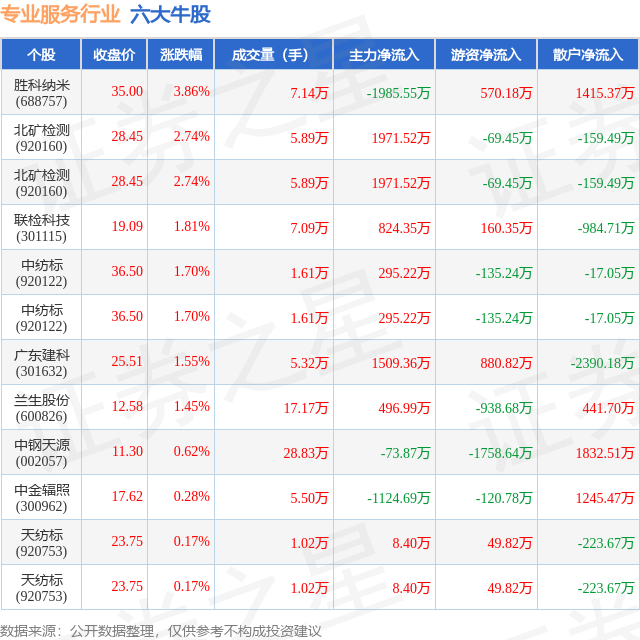 个股表现方面,专业服务行业当日领涨股为胜科纳米(688757),该股当日报收35.0,上涨3.86%,成交量7.14万,主力资金净流出1985.55万元。北矿检测(920160)以上涨2.74%紧随其后,该股当日成交量5.89万,主力资金净流入1971.52万元。除此之外,北矿检测(920160)、联检科技(301115)、中纺标(920122)均进入当日牛股之列。具体个股列表见下表: