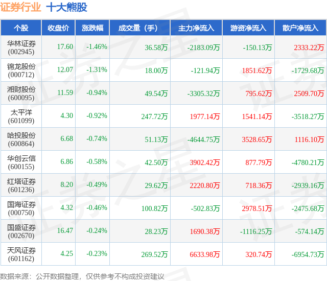 个股表现方面,证券行业当日领跌股为华林证券(002945),该股当日报收17.6,下跌1.46%,成交量36.58万,主力资金净流出2183.09万元。锦龙股份(000712)以下跌1.31%紧随其后,该股当日成交量18.0万,主力资金净流出121.94万元。除此之外,湘财股份(600095)、太平洋(601099)、哈投股份(600864)均进入当日熊股之列。具体个股列表见下表: