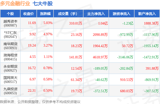 个股表现方面,多元金融行业当日领涨股为越秀资本(000987),该股当日报收11.69,上涨5.03%,成交量310.01万,主力资金净流入1.04亿元。*ST仁东(002647)以上涨4.97%紧随其后,该股当日成交量23.16万,主力资金净流入2090.89万元。除此之外,南华期货(603093)、渤海租赁(000415)、永安期货(600927)均进入当日牛股之列。具体个股列表见下表: