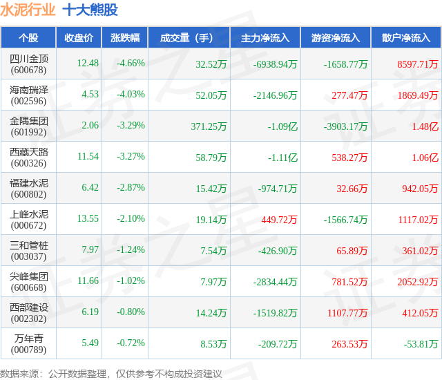 个股表现方面,水泥行业当日领跌股为四川金顶(600678),该股当日报收12.48,下跌4.66%,成交量32.52万,主力资金净流出6938.94万元。海南瑞泽(002596)以下跌4.03%紧随其后,该股当日成交量52.05万,主力资金净流出2146.96万元。除此之外,金隅集团(601992)、西藏天路(600326)、福建水泥(600802)均进入当日熊股之列。具体个股列表见下表: