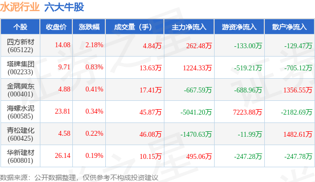 个股表现方面,水泥行业当日领涨股为四方新材(605122),该股当日报收14.08,上涨2.18%,成交量4.84万,主力资金净流入262.48万元。塔牌集团(002233)以上涨0.83%紧随其后,该股当日成交量13.63万,主力资金净流入1224.33万元。除此之外,金隅冀东(000401)、海螺水泥(600585)、青松建化(600425)均进入当日牛股之列。具体个股列表见下表: