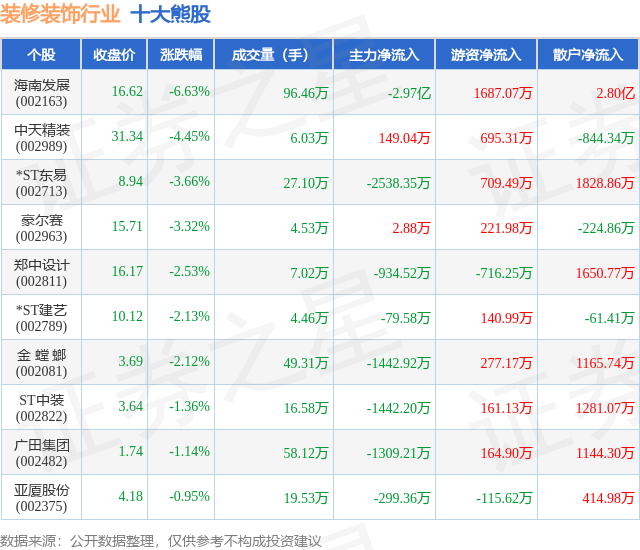 个股表现方面,装修装饰行业当日领跌股为海南发展(002163),该股当日报收16.62,下跌6.63%,成交量96.46万,主力资金净流出2.97亿元。中天精装(002989)以下跌4.45%紧随其后,该股当日成交量6.03万,主力资金净流入149.04万元。除此之外,*ST东易(002713)、豪尔赛(002963)、郑中设计(002811)均进入当日熊股之列。具体个股列表见下表:
