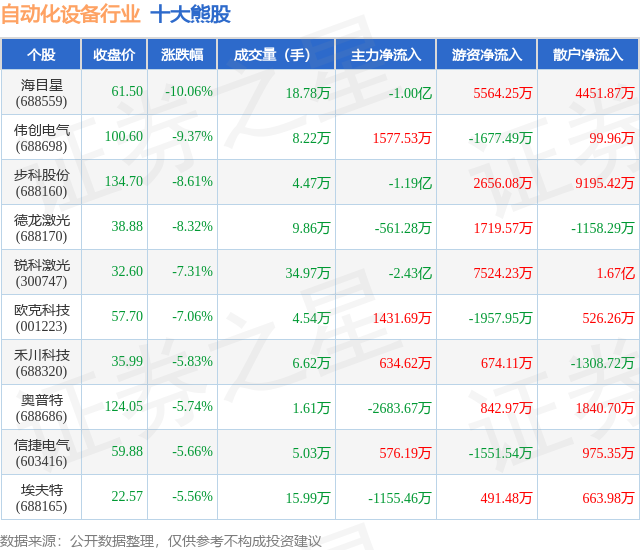 个股表现方面,自动化设备行业当日领跌股为海目星(688559),该股当日报收61.5,下跌10.06%,成交量18.78万,主力资金净流出1.0亿元。伟创电气(688698)以下跌9.37%紧随其后,该股当日成交量8.22万,主力资金净流入1577.53万元。除此之外,步科股份(688160)、德龙激光(688170)、锐科激光(300747)均进入当日熊股之列。具体个股列表见下表: