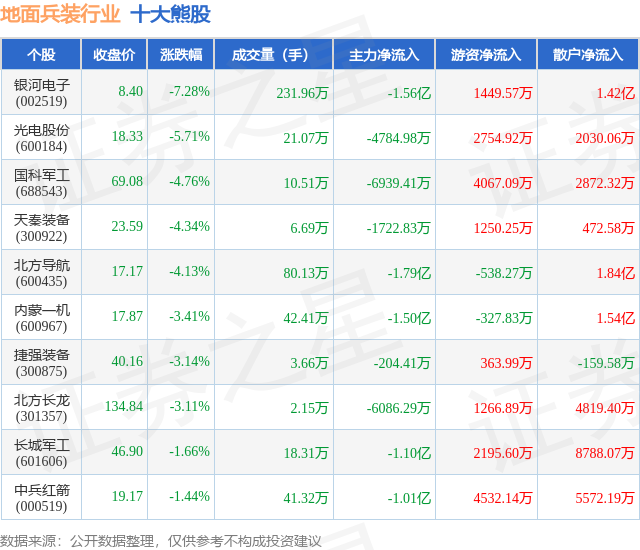 个股表现方面,地面兵装行业当日领跌股为银河电子(002519),该股当日报收8.4,下跌7.28%,成交量231.96万,主力资金净流出1.56亿元。光电股份(600184)以下跌5.71%紧随其后,该股当日成交量21.07万,主力资金净流出4784.98万元。除此之外,国科军工(688543)、天秦装备(300922)、北方导航(600435)均进入当日熊股之列。具体个股列表见下表: