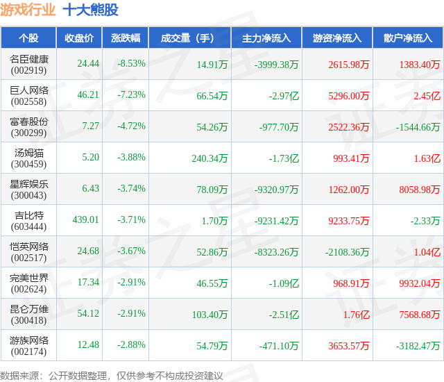 个股表现方面,游戏行业当日领跌股为名臣健康(002919),该股当日报收24.44,下跌8.53%,成交量14.91万,主力资金净流出3999.38万元。巨人网络(002558)以下跌7.23%紧随其后,该股当日成交量66.54万,主力资金净流出2.97亿元。除此之外,富春股份(300299)、汤姆猫(300459)、星辉娱乐(300043)均进入当日熊股之列。具体个股列表见下表: