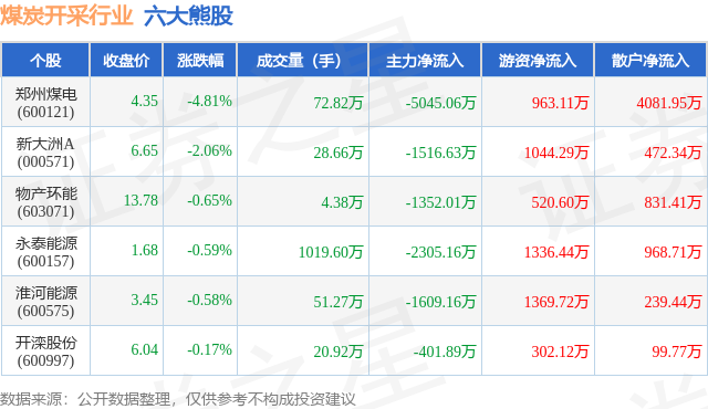 个股表现方面,煤炭开采行业当日领跌股为郑州煤电(600121),该股当日报收4.35,下跌4.81%,成交量72.82万,主力资金净流出5045.06万元。新大洲A(000571)以下跌2.06%紧随其后,该股当日成交量28.66万,主力资金净流出1516.63万元。除此之外,物产环能(603071)、永泰能源(600157)、淮河能源(600575)均进入当日熊股之列。具体个股列表见下表: