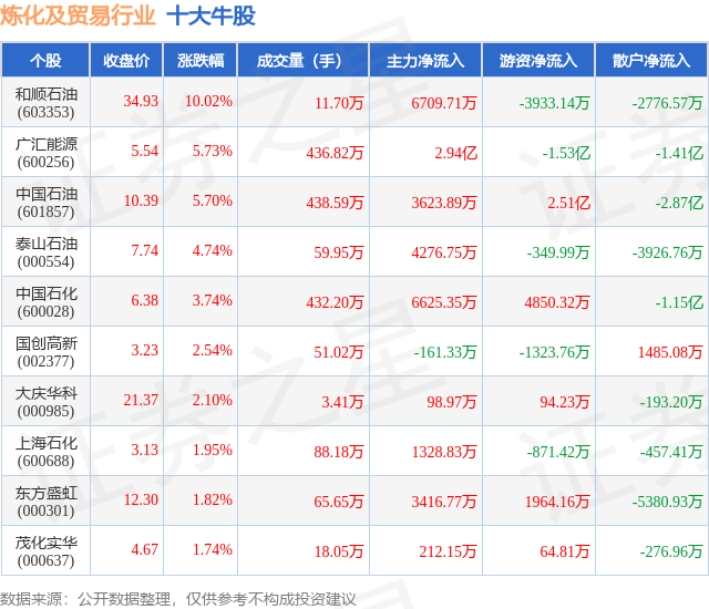 个股表现方面,炼化及贸易行业当日领涨股为和顺石油(603353),该股当日报收34.93,上涨10.02%,成交量11.7万,主力资金净流入6709.71万元。广汇能源(600256)以上涨5.73%紧随其后,该股当日成交量436.82万,主力资金净流入2.94亿元。除此之外,中国石油(601857)、泰山石油(000554)、中国石化(600028)均进入当日牛股之列。具体个股列表见下表: