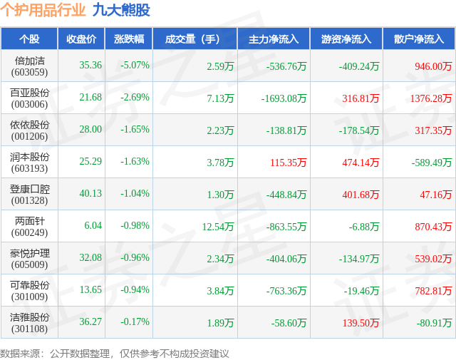 个股表现方面,个护用品行业当日领跌股为倍加洁(603059),该股当日报收35.36,下跌5.07%,成交量2.59万,主力资金净流出536.76万元。百亚股份(003006)以下跌2.69%紧随其后,该股当日成交量7.13万,主力资金净流出1693.08万元。除此之外,依依股份(001206)、润本股份(603193)、登康口腔(001328)均进入当日熊股之列。具体个股列表见下表: