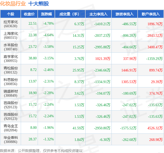个股表现方面,化妆品行业当日领跌股为拉芳家化(603630),该股当日报收22.51,下跌4.78%,成交量6.37万,主力资金净流出1410.21万元。上海家化(600315)以下跌4.64%紧随其后,该股当日成交量14.31万,主力资金净流出2037.23万元。除此之外,水羊股份(300740)、嘉亨家化(300955)、青松股份(300132)均进入当日熊股之列。具体个股列表见下表: