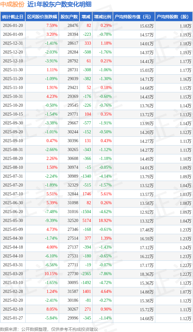 从股价来看,2026年1月9日至2026年1月20日,中成股份区间涨幅为7.59%,在此期间股东户数增加82.0户,增幅为0.29%。