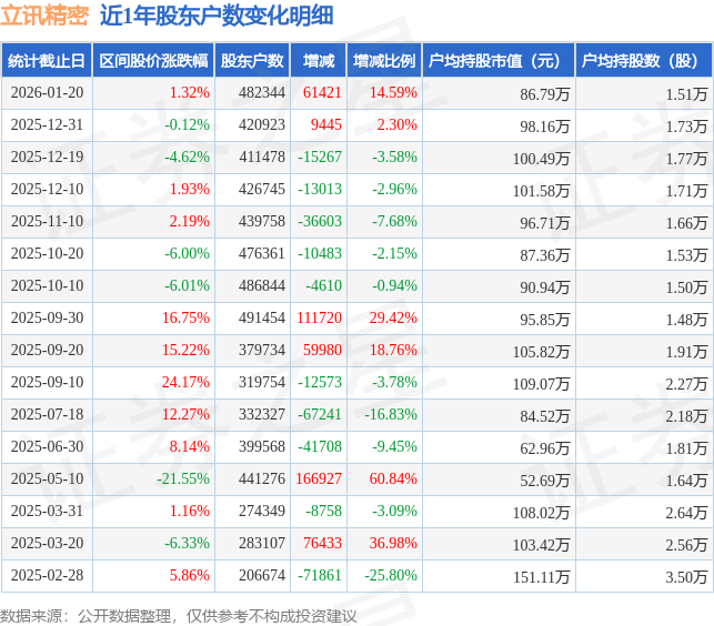 从股价来看,2025年12月31日至2026年1月20日,立讯精密区间涨幅为1.32%,在此期间股东户数增加6.14万户,增幅为14.59%。