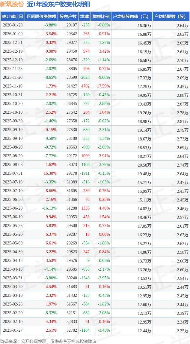 从股价来看,2026年1月9日至2026年1月20日,新筑股份区间跌幅为3.88%,在此期间股东户数减少235.0户,减幅为0.8%。