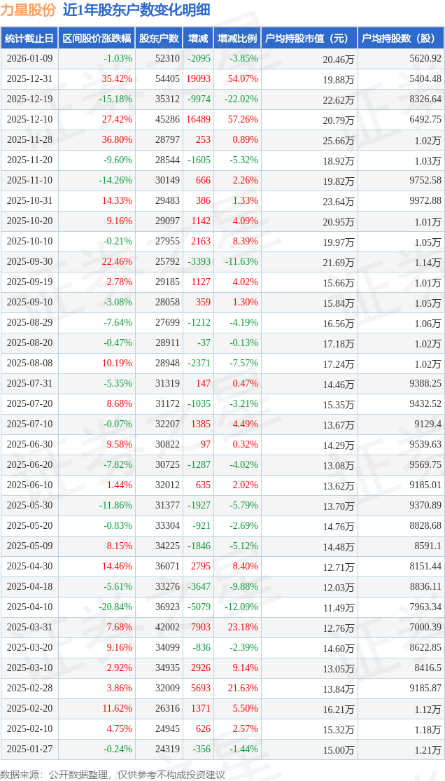 证券之星消息,近日力星股份披露,截至2026年1月9日公司股东户数为5.23万户,较12月31日减少2095.0户,减幅为3.85%。户均持股数量由上期的5404.0股增加至5621.0股,户均持股市值为20.46万元。