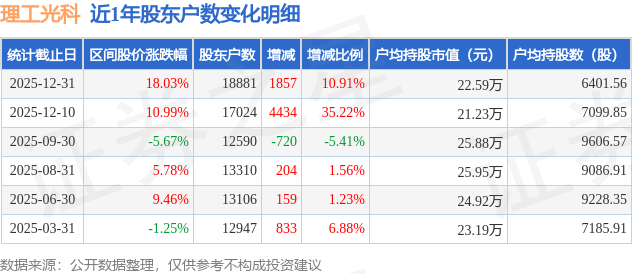 从股价来看,2025年12月10日至2025年12月31日,理工光科区间涨幅为18.03%,在此期间股东户数增加1857.0户,增幅为10.91%。