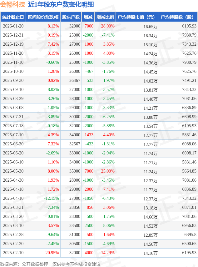 从股价来看,2026年1月9日至2026年1月20日,会畅科技区间涨幅为8.13%,在此期间股东户数增加7000.0户,增幅为28.0%。