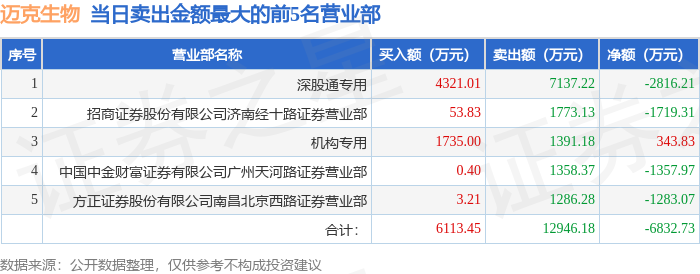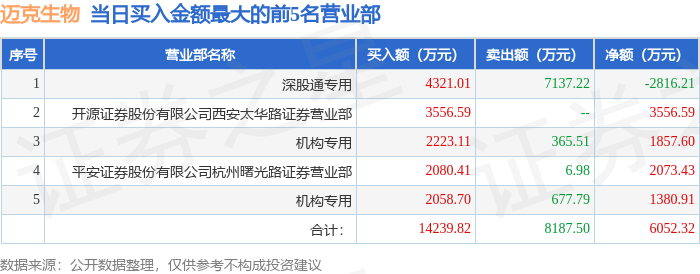 证券之星消息,沪深交易所2026年1月26日公布的交易公开信息显示,迈克生物(300463)因日涨幅达到15%的前5只证券登上龙虎榜。此次是近5个交易日内第1次上榜。
