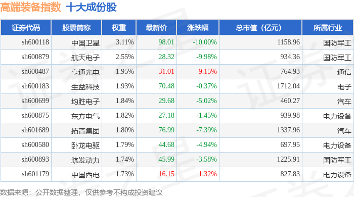 证券之星消息,1月26日,高端装备(000097)指数报收于12881.63点,跌1.77%,成交2536.52亿元,换手率3.45%。当日该指数成份股中,上涨的有13家,中控技术以12.98%的涨幅领涨,下跌的有46家,中国卫星以10.0%的跌幅领跌。