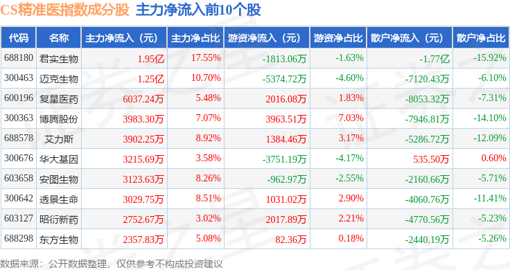 资金流向方面,CS精准医(000863)指数成份股当日主力资金净流入合计1.5亿元,游资资金净流出合计2.33亿元,散户资金净流入合计8307.31万元。成份股资金流向详情见下表: