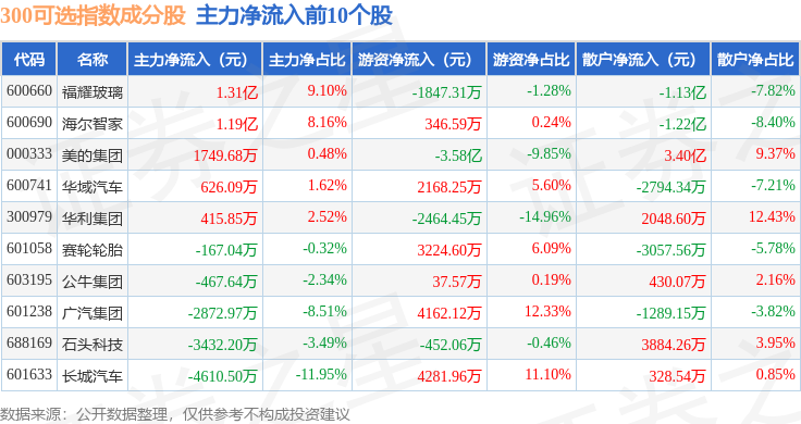资金流向方面,300可选(000911)指数成份股当日主力资金净流出合计40.96亿元,游资资金净流入合计7.08亿元,散户资金净流入合计33.88亿元。成份股资金流向详情见下表: