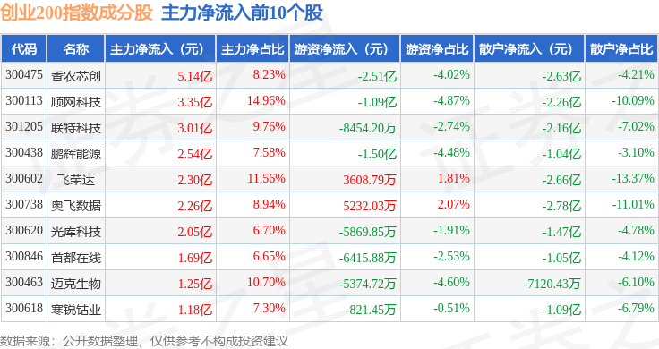 资金流向方面,创业200(399019)指数成份股当日主力资金净流出合计83.13亿元,游资资金净流入合计37.06亿元,散户资金净流入合计46.07亿元。成份股资金流向详情见下表:
