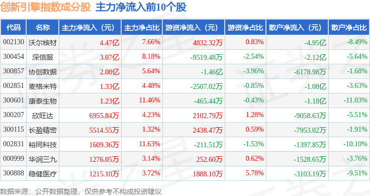 资金流向方面,创新引擎(399050)指数成份股当日主力资金净流出合计72.57亿元,游资资金净流入合计22.14亿元,散户资金净流入合计50.42亿元。成份股资金流向详情见下表: