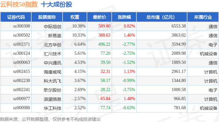 云科技50(399279)指数十大成份股详情如下: