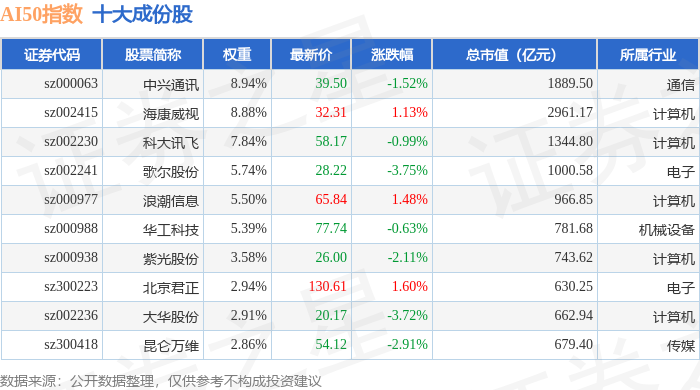 资金流向方面,AI50(399284)指数成份股当日主力资金净流出合计29.62亿元,游资资金净流入合计5.23亿元,散户资金净流入合计24.39亿元。成份股资金流向详情见下表: