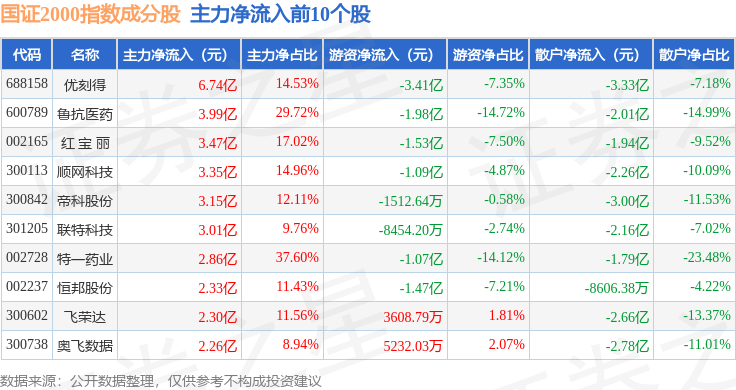 资金流向方面,国证2000(399303)指数成份股当日主力资金净流出合计399.96亿元,游资资金净流入合计154.51亿元,散户资金净流入合计243.42亿元。成份股资金流向详情见下表: