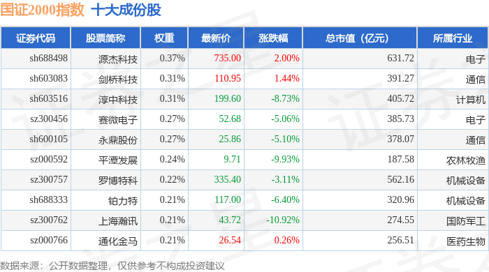 证券之星消息,1月26日,国证2000(399303)指数报收于11021.31点,跌1.36%,成交10278.41亿元,换手率4.66%。当日该指数成份股中,上涨的有565家,迈克生物以20.03%的涨幅领涨,下跌的有1414家,昊志机电以13.89%的跌幅领跌。