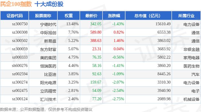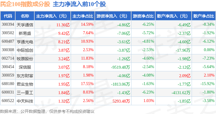 资金流向方面,民企100(399362)指数成份股当日主力资金净流出合计90.45亿元,游资资金净流出合计1.91亿元,散户资金净流入合计92.36亿元。成份股资金流向详情见下表: