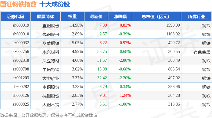 国证钢铁(399440)指数十大成份股详情如下:
